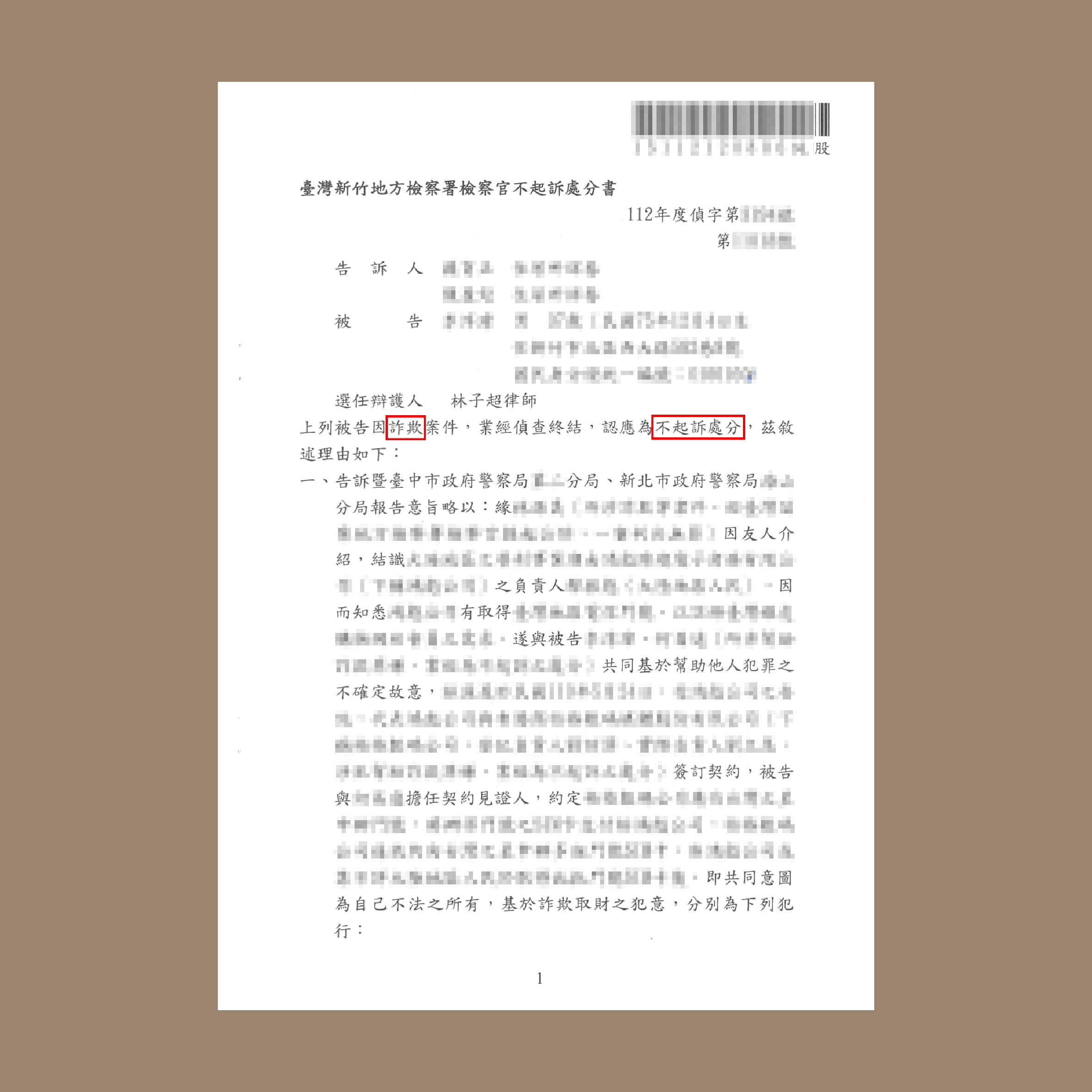 當事人居中促成商業合作,並在商業合作契約中作為見證人,竟因合作糾紛遭提出詐欺刑事告訴。經本所林子超律師協助辯護,整理洽談及合作過程,提出證據說明脈絡,成功取得不起訴處分。