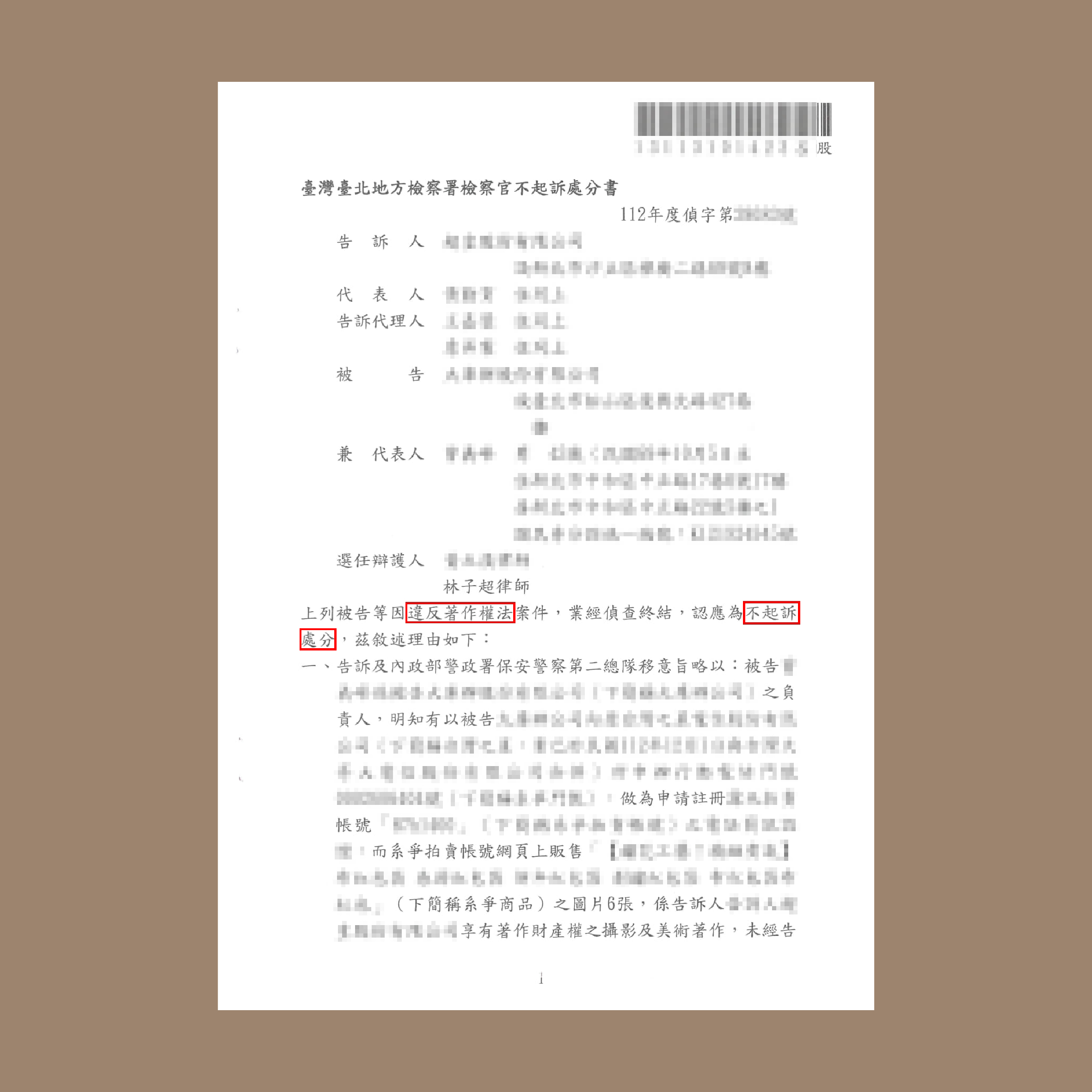 當事人經營公司事業,竟遭不明人士利用公司名義盜用他人著作,因著作權人提出刑事告訴,當事人涉及違反著作權法罪嫌。經本所林子超律師協助辯護,解釋並證明冒名盜用著作與當事人無關,成功取得不起訴處分。